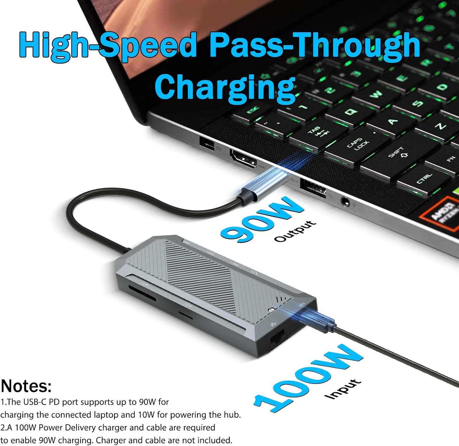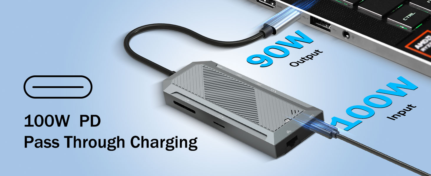 Dukungan pengiriman daya memastikan perangkat tetap terisi daya saat hub digunakan. Port USB-C PD memungkinkan daya melewati hub dan masuk ke laptop atau tablet yang terhubung.