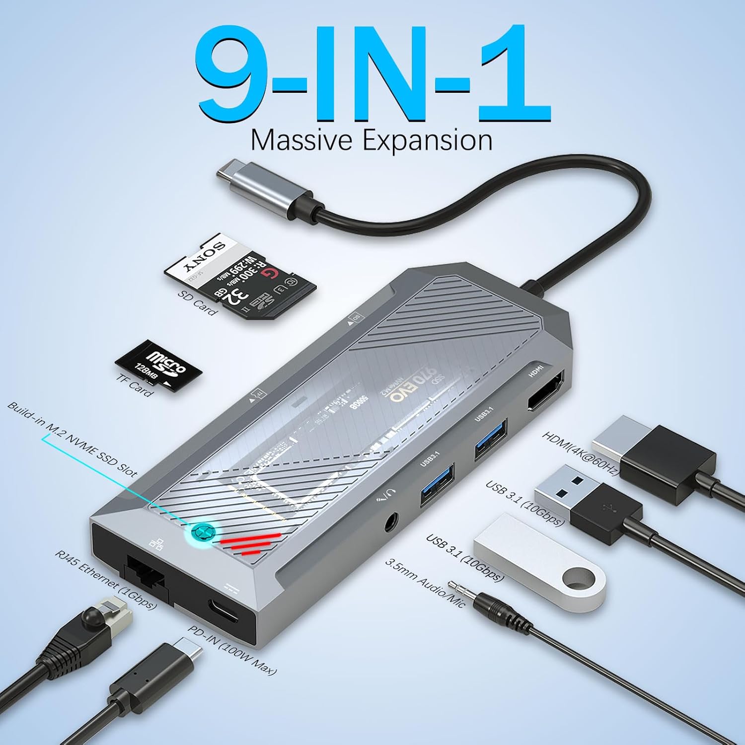 Hub USB-C 9-in-1 dengan Enklosur SSD untuk M.2 NVMe 4K 60Hz HDMI Splitter – Konektivitas Terbaik dan Ekspansi Penyimpanan Berkecepatan Tinggi