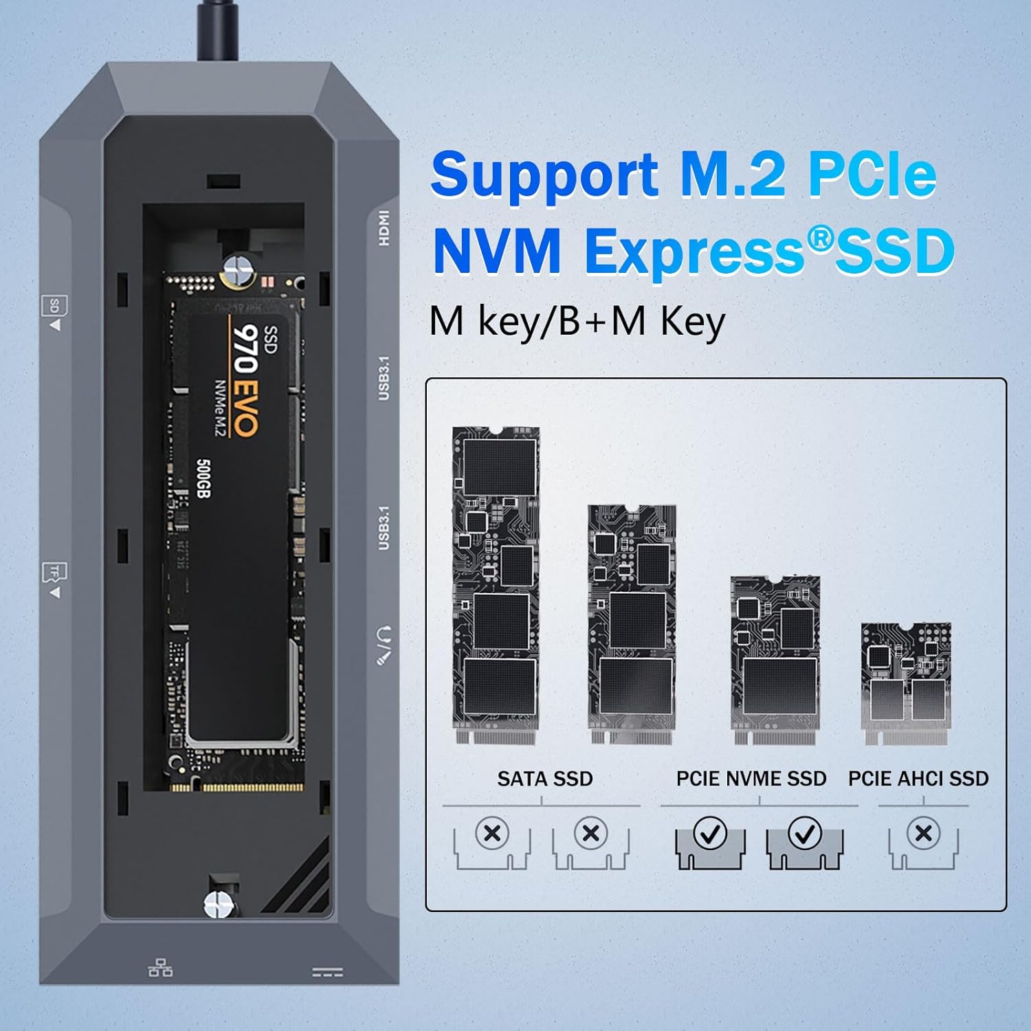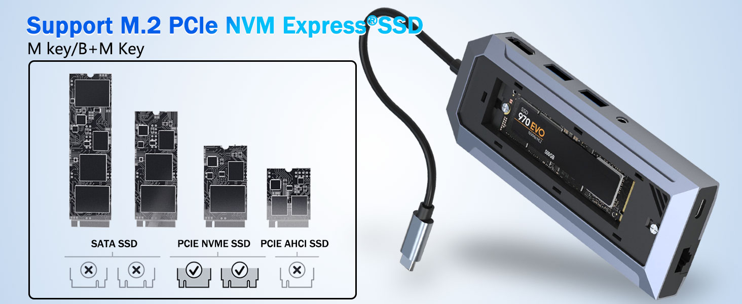 Salah satu fitur menonjol dari Hub USB-C 9-in-1 dengan Enklosur SSD untuk M.2 NVMe 4K 60Hz HDMI Splitter adalah enklosur SSD M.2 NVMe bawaannya. Hal ini memungkinkan pengguna untuk memasang solid-state drive NVMe berkecepatan tinggi langsung ke hub.