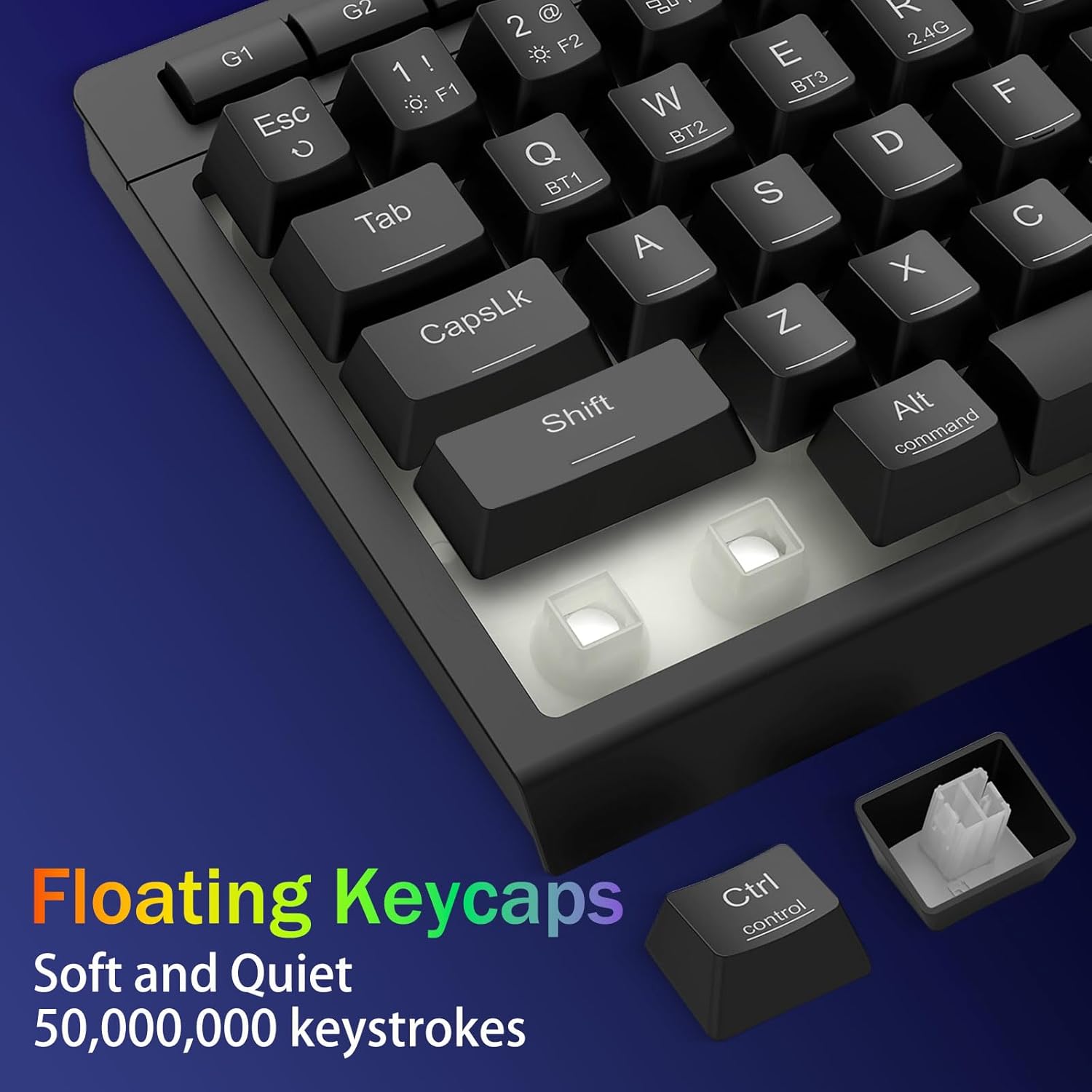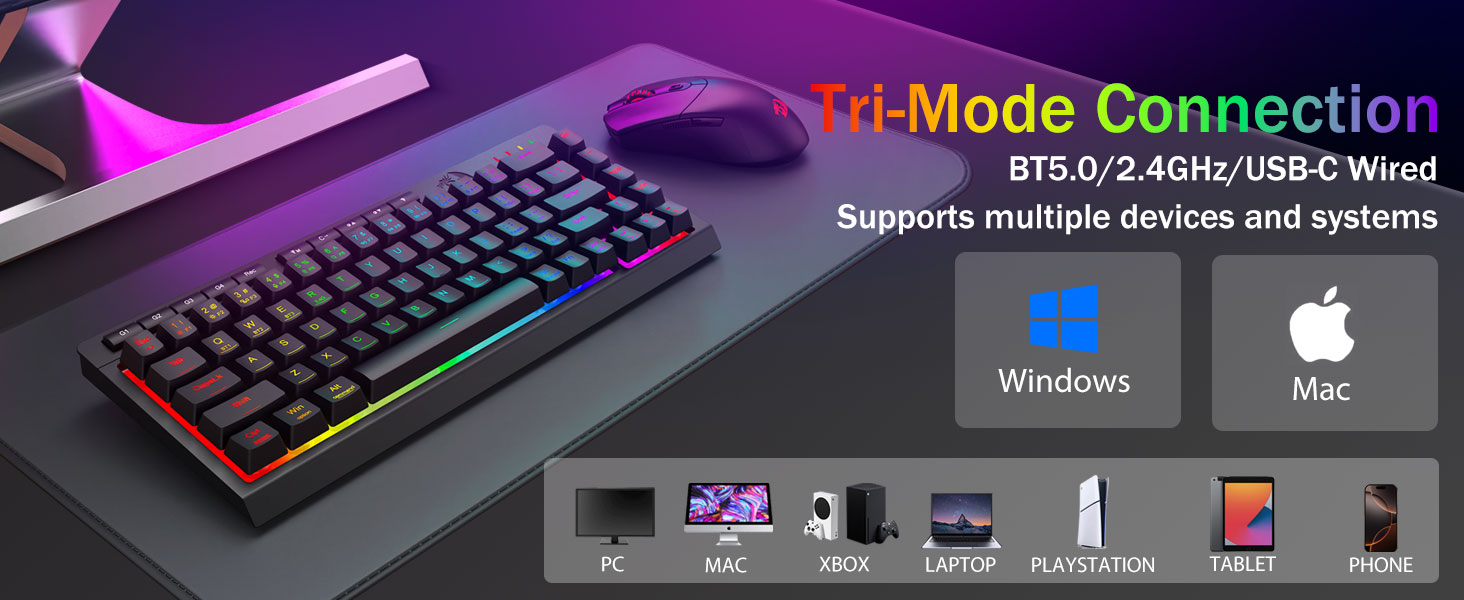 Fleksibilitas Tri-Mode & Penguasaan Multi-Perangkat -Beralih dengan mulus antara mode Bluetooth 5.0, nirkabel 2.4GHz, atau kabel USB-C, menghubungkan hingga 5 perangkat secara bersamaan (PC, Mac, tablet, ponsel, PS/XBOX). Beralih perangkat dengan mudah melalui tombol pintasan atau tombol samping—sempurna untuk pengaturan kerja/game hybrid. Tetap bertenaga selama berminggu-minggu dengan baterai 4.000mAh (siaga 30+ hari, runtime RGB 50 jam).