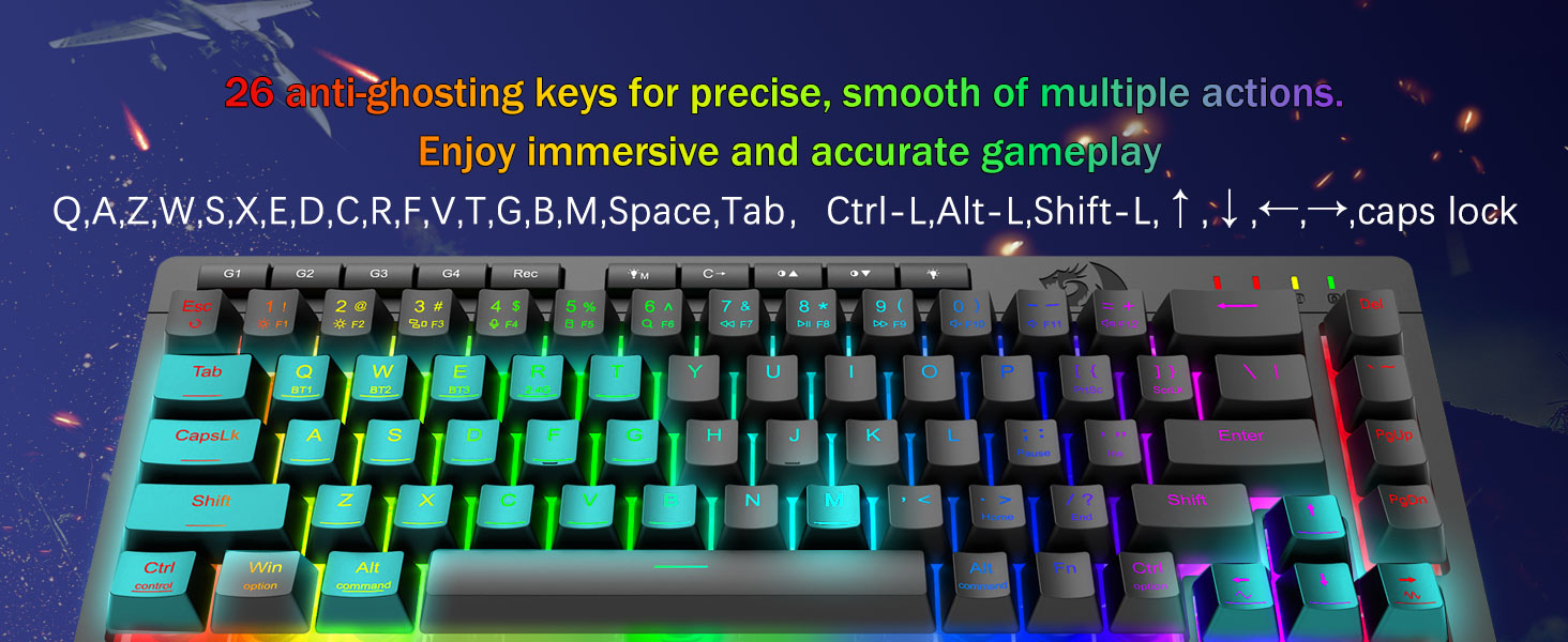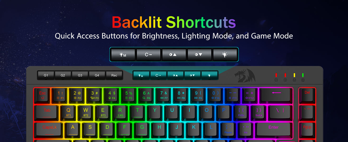 Performa Gaming Kelas Pro & Kontrol Lampu Latar Khusus -Dilengkapi tombol anti-ghosting (tombol dengan garis bawah) yang memungkinkan 26 tombol bekerja secara bersamaan untuk respons game yang cepat dan akurat sesuai keinginan Anda. Tombol Akses Cepat untuk Kecerahan, Mode Pencahayaan, dan Mode Permainan untuk menyesuaikan kecerahan, profil pencahayaan, dan mengaktifkan mode permainan dengan cepat hanya dengan satu sentuhan tombol.