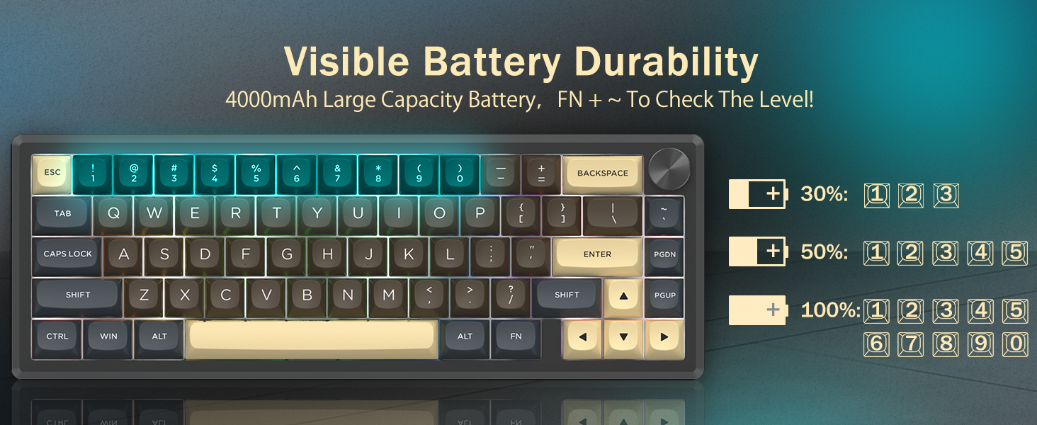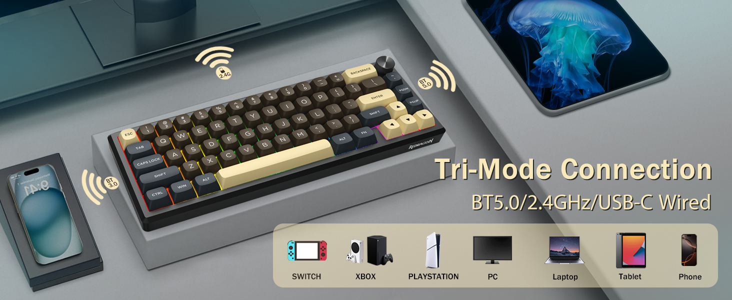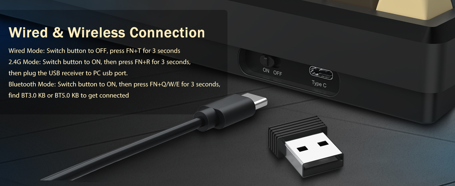 Keyboard mendukung konektivitas nirkabel untuk kenyamanan dan koneksi USB kabel untuk kinerja yang stabil. Pengguna dapat beralih antar mode tergantung pada pengaturannya.