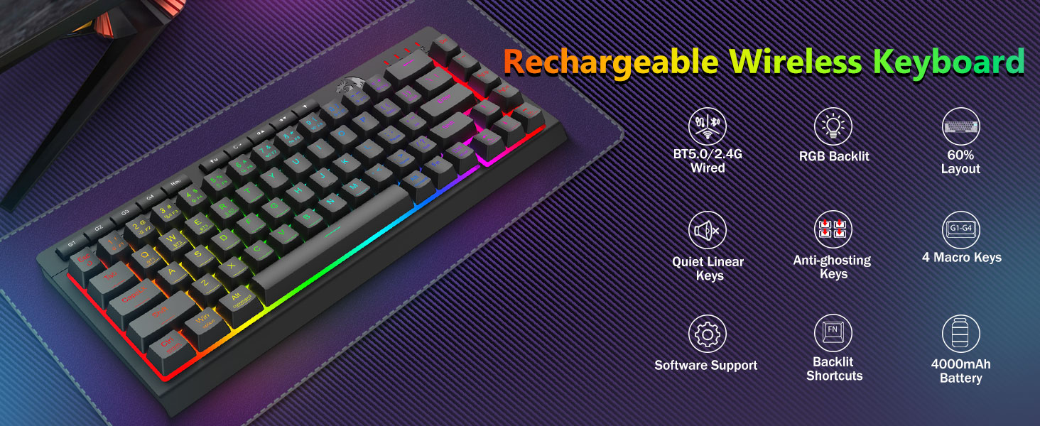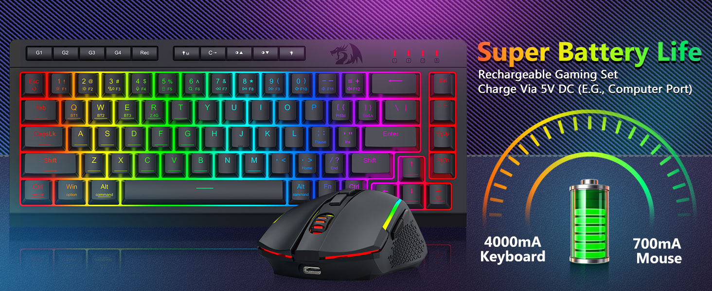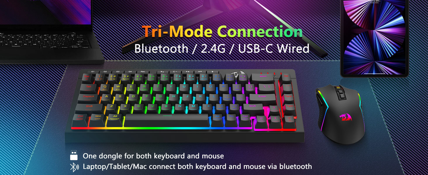 Keyboard dan Mouse Serbaguna Tri-Mode- Beralih dengan mulus antara mode Bluetooth 5.0, nirkabel 2.4GHz, atau kabel USB-C, menghubungkan hingga perangkat yang berbeda (PC, Mac, tablet, ponsel, PS/XBOX). Beralih perangkat dengan mudah melalui tombol pintasan atau tombol samping—sempurna untuk pengaturan kerja/game hybrid. Tetap bertenaga selama berminggu-minggu dengan keyboard baterai 4.000mAh dan Mouse baterai 700mAh (siaga 30+ hari, runtime RGB 50 jam).