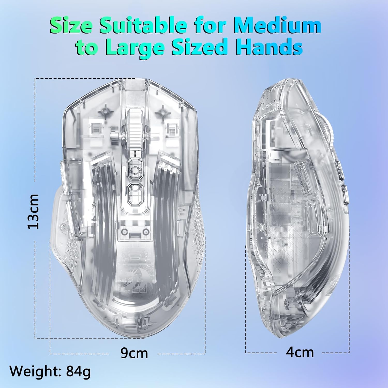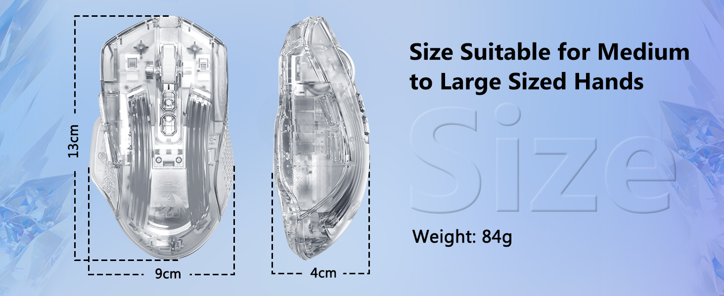 Mouse dibentuk agar pas secara alami di tangan, mendukung penggunaan jangka panjang tanpa ketegangan berlebihan. Strukturnya memungkinkan gaya genggaman yang nyaman, termasuk genggaman telapak tangan, cakar, dan ujung jari.