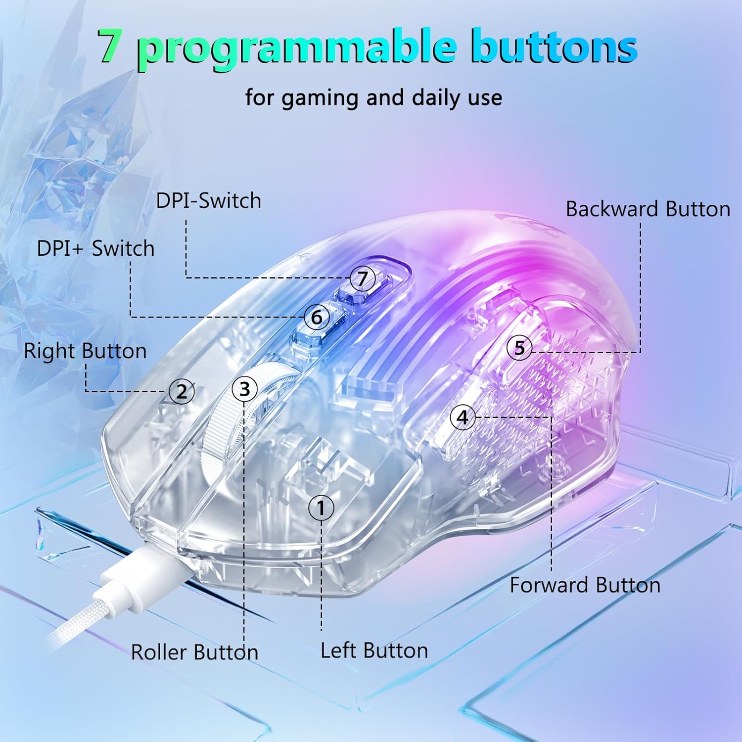 CHUANGQUAN White M695CT 24,000 DPI 8 RGB LED Backlit Mode Wired Gaming Mouse menghadirkan pelacakan ultra-presisi, kontrol halus, dan pencahayaan dinamis, dibuat untuk gamer yang menginginkan kecepatan, akurasi, dan gaya.
