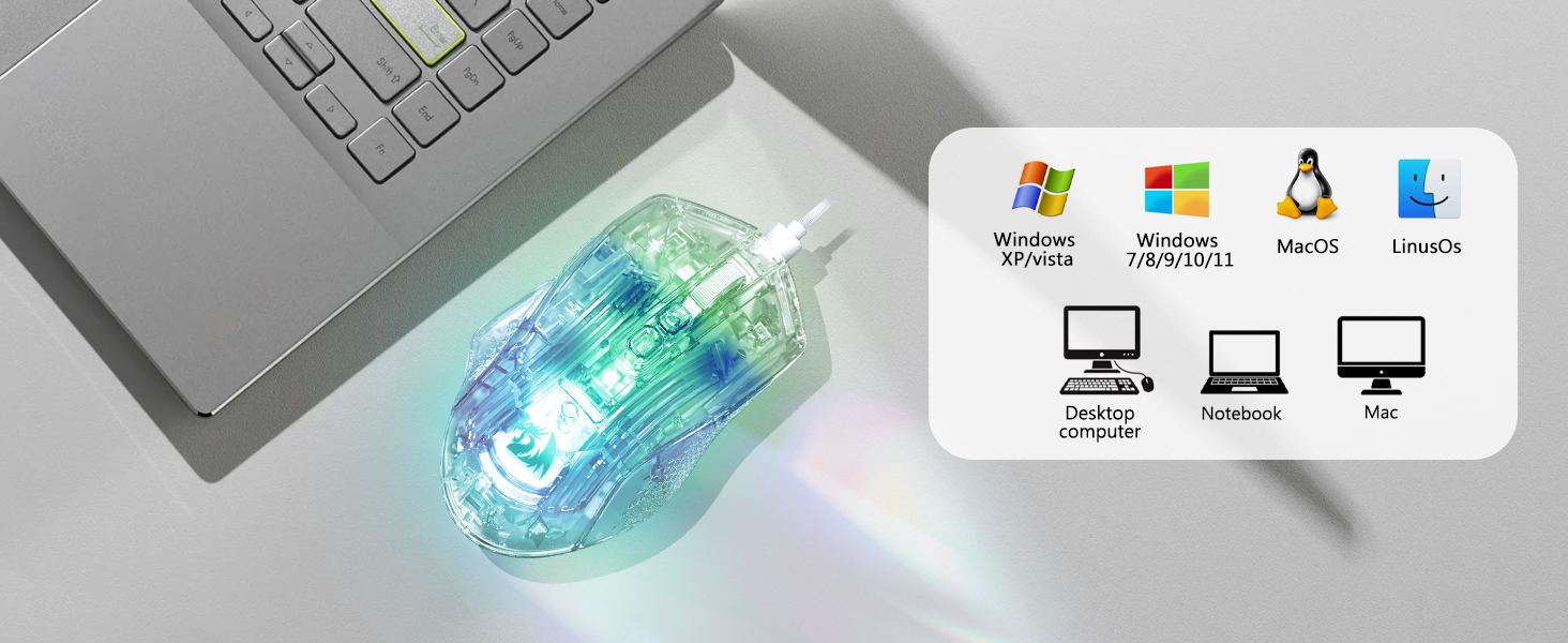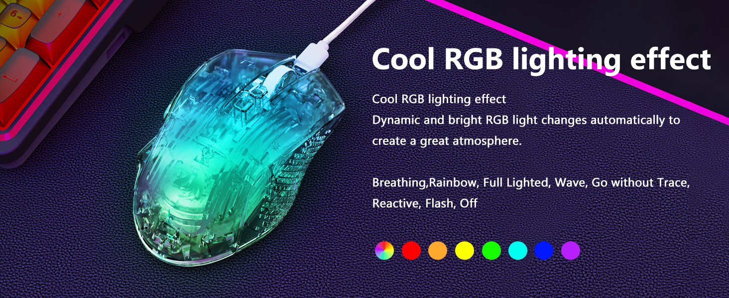 Mouse ini dilengkapi delapan efek pencahayaan RGB yang meningkatkan daya tarik visual tanpa memengaruhi performa. Pengguna dapat beralih di antara mode pencahayaan untuk menyesuaikan pengaturan atau preferensi pribadi mereka.